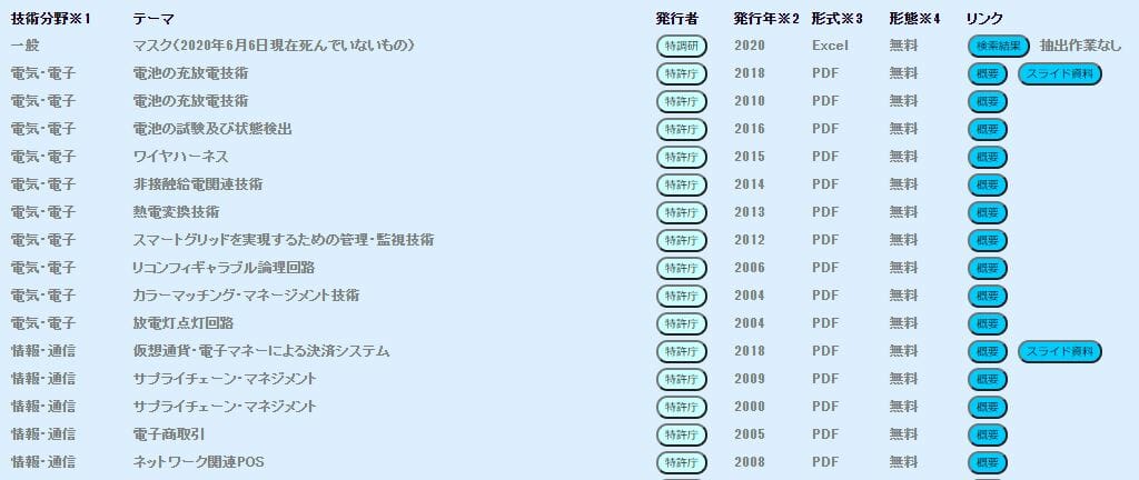 • 無料のレポートを中心に掲載しています。基本的に、非公開レポートへのリンクはありません。主に、特許庁、日本特許情報機構(Japio)、日本医療研究開発機構(AMED)のレポートへのリンクを掲載しています。